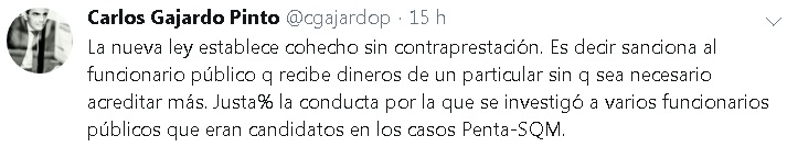 Entre estos estuvo el ex fiscal Carlos Gajardo, ex persecutor encargado de indagar sus ilícitos, quien señaló en su cuenta personal que el proyecto votado "sanciona al funcionario público que recibe dineros de un particular sin que sea necesario acreditar más. Justamente la conducta por la que se investigó a varios funcionarios públicos que eran candidatos en los casos Penta-SQM".