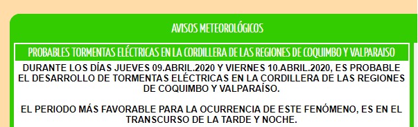 Lee también: Gobierno ratifica adelanto de vacaciones de invierno: Comienzan el lunes 13 de abrilEn tanto, la Dirección Meteorológica de Chile advierte de tormentas eléctricas en la cordillera del centro-norte.