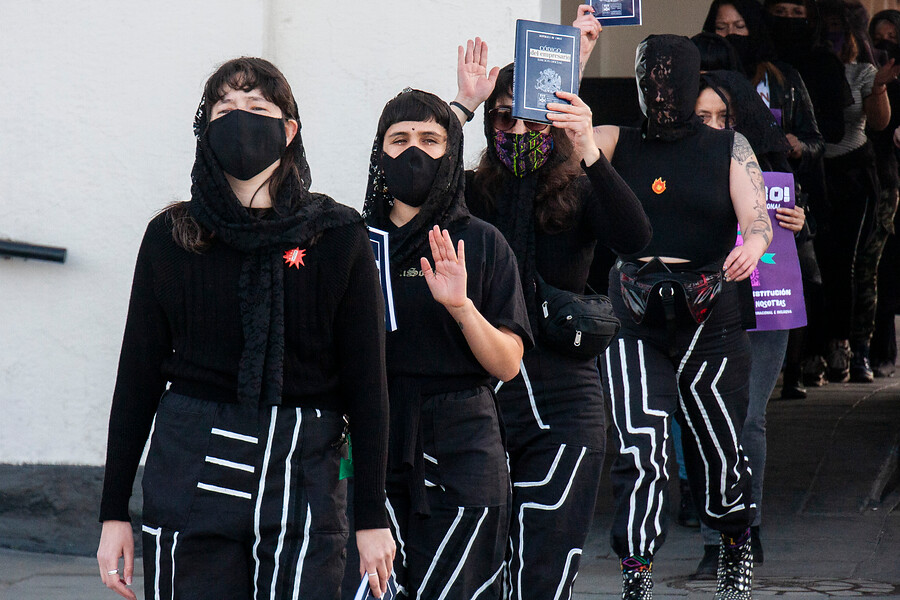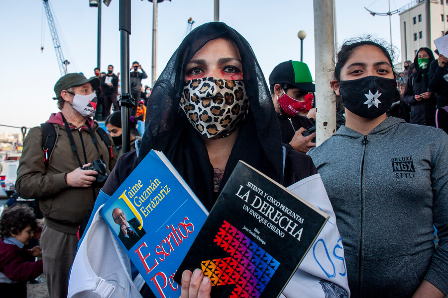 La intervención tuvo lugar en el Muelle Prat de Valparaíso, hasta donde llegaron junto a decenas de mujeres para realizar una especie de "funeral" de la Carta Magna.