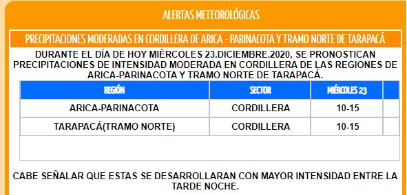 La Oficina Nacional de Emergencias (Onemi) decretó Alerta Temprana Preventiva en las provincias de Parinacota (Arica-Parinacota) y Tamarugal (Tarapacá) ante el pronóstico de “precipitaciones moderadas (entre 10 y 15 milímetros)” para esta tarde-noche de miércoles 23 de diciembre.