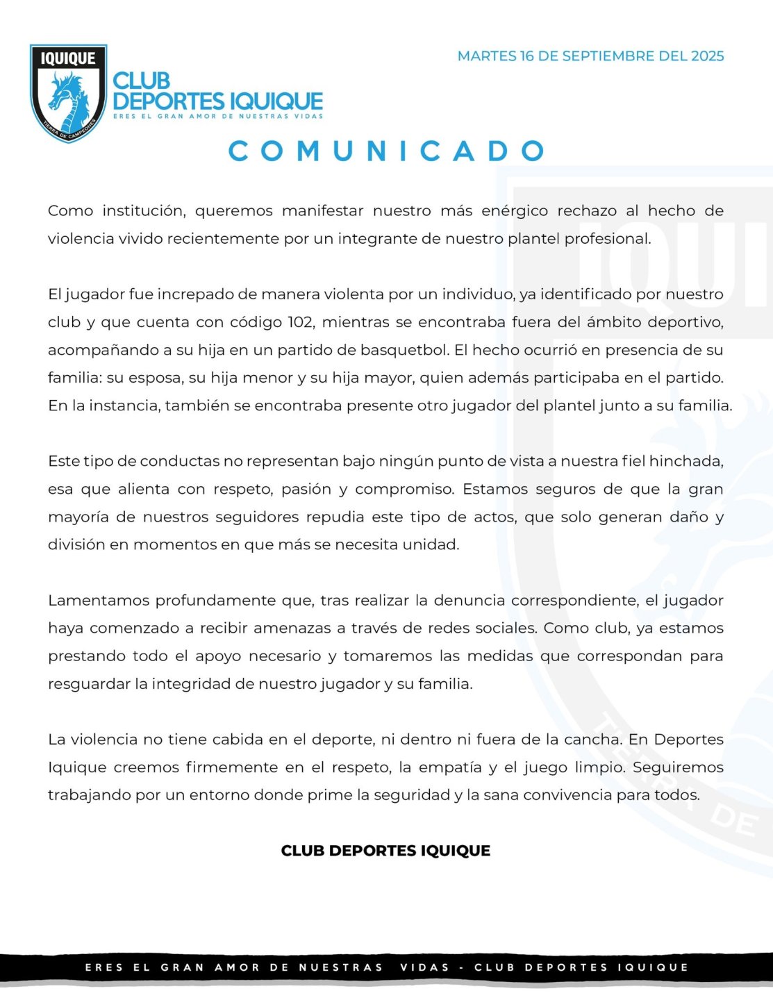 Un grave hecho de violencia se vivió en el norte del país, donde el futbolista de Deportes Iquique, Marcelo Jorquera fue amenazado de muerte en pleno partido de básquetbol de su hija.