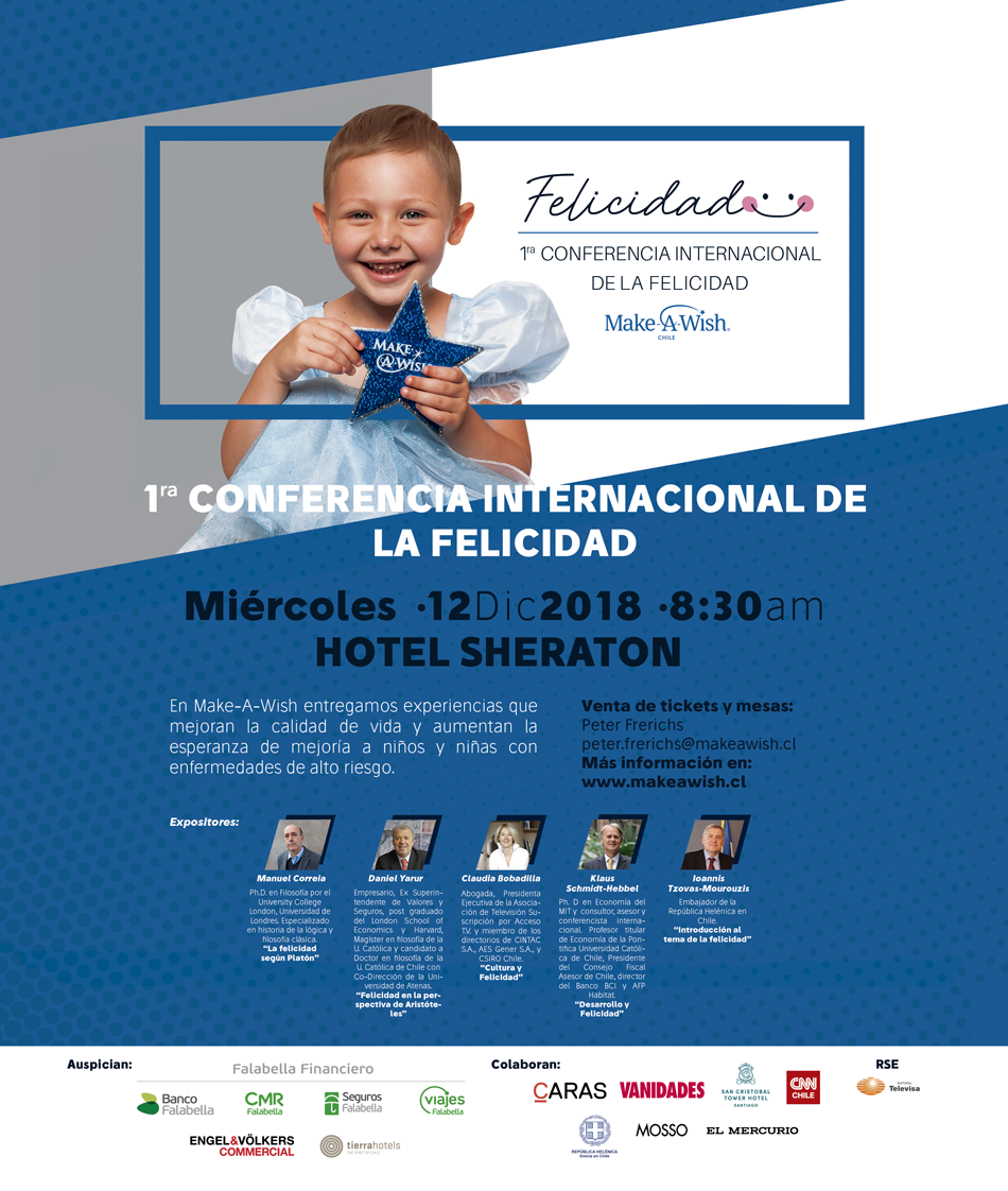 Es por eso que se realizará la primera Conferencia Internacional de la Felicidad el día miércoles 12 de diciembre de 8:30 a 13:30 horas en el hotel Sheraton Santiago, donde expondrán sobre el tema: Manuel Correia, Ph. D y profesor del Instituto de Filosofía de Pontificia Universidad Católica; Klaus Schmidt-Hebbel, Ph. D. y consultor, asesor y conferencista internacional; Daniel Yarur, Máster en Filosofía de la Universidad Católica y candidato a PhD en Filosofía de Universidad Católica de Chile con dirección de la Universidad de Atenas; Claudia Bobadilla, abogada y directora de empresas; y Ioannis Tzovas-Mourouzis, embajador de Grecia en Chile.