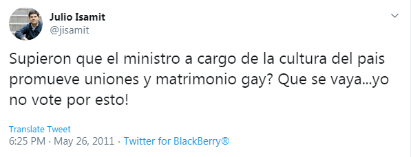 "Supieron que el ministro a cargo de la cultura del país promueve uniones y matrimonio gay? Que se vaya... Yo no voté por esto", escribió.