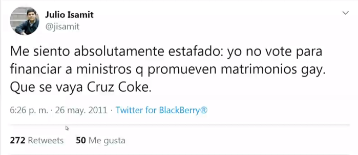 "Me siento absolutamente estafado: yo no voté para financiar ministros que promueven matrimonios gay. Que se vaya Cruz-Coke", continuó.