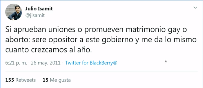 Luego, además agregó que "si aprueban uniones o promueven matrimonio gay o aborto: seré opositor a este gobierno y me da lo mismo cuánto crezcamos al año".