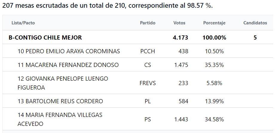 Seguido de Fernández, la candidata que obtuvo la segunda mayoría de las votaciones fue María Fernanda Villegas Acevedo del Partido Socialista (PS), quien recibió un 34.56% de los sufragios (1.443).