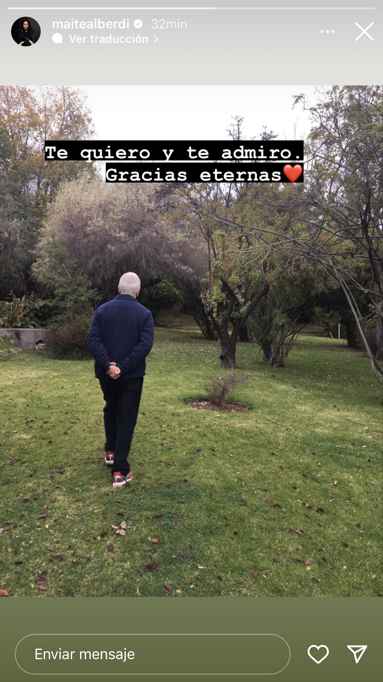 A través de su cuenta de Instagram, la documentalista publicó una storie que muestra a Góngora de espalda caminando por un paisaje verde. "Te quiero y te admiro. Gracias eternas", dijo en un breve texto escrito sobre la imagen.