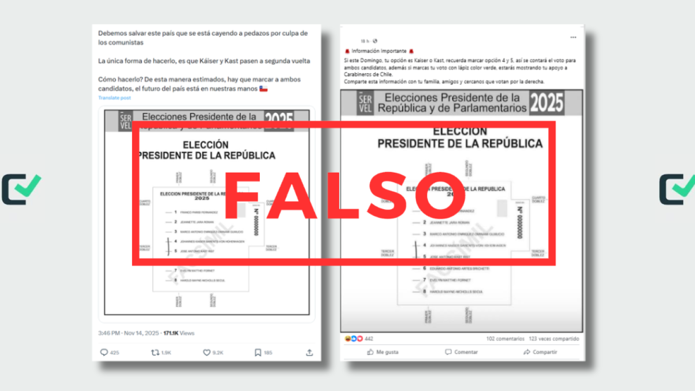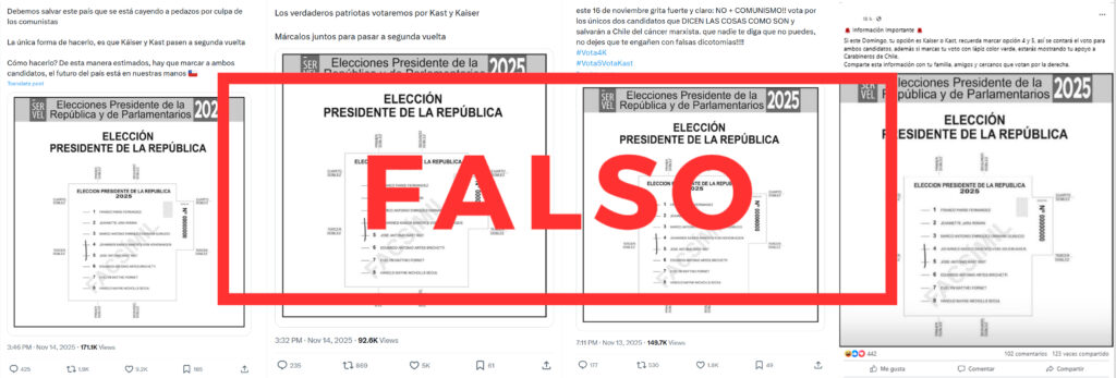 Según las publicaciones, compartidas más de 4.200 veces en X (1, 2), Facebook, Instagram y Threads desde el 13 de noviembre, cada elector tendría que marcar con una línea a los candidatos que desea que pasen a la segunda vuelta, prevista para el 14 de diciembre.