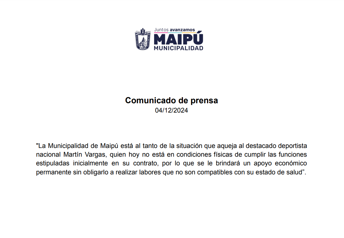 Por último, Martín Vargas afirmó: "No estoy solicitando caridad, solo una oportunidad para continuar haciendo lo que sé hacer: Transmitir mi experiencia y conocimiento a los niños y jóvenes de Maipú. Si eso ya no es posible, lo mínimo que espero es que mi desvinculación se maneje con el respeto y la dignidad que cualquier persona merece, especialmente alguien que ha dedicado su vida al deporte y a la comuna".