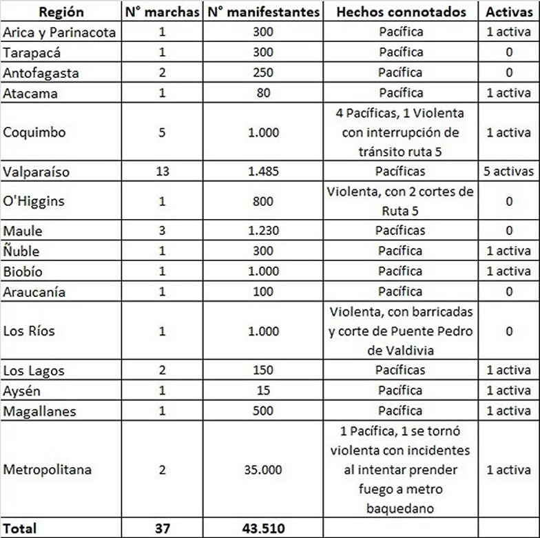Asimismo, señalan que Valparaíso fue la región con mayor cantidad de marchas, sumando 13 movilizaciones pacíficas.