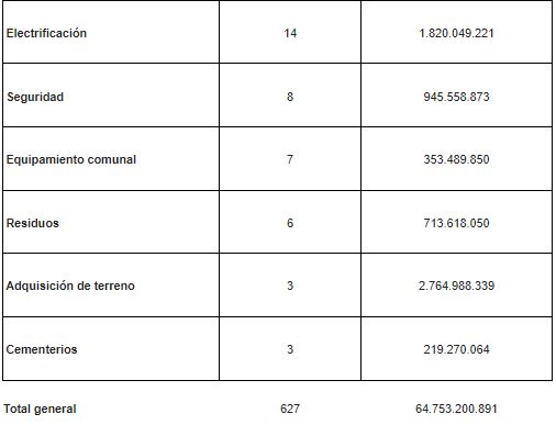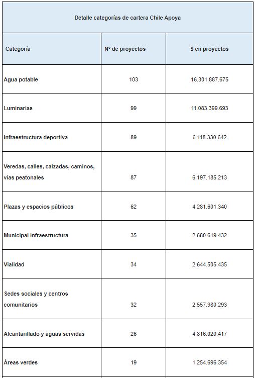 Los proyectos de "agua potable" son los que registran el mayor número, con 103 en todo el país y un monto de más de $16 mil millones, le sigue "luminarias", con 99, y un monto superior a $11 mil millones, y en tercer lugar aparece "infraestructura deportiva", con 89 iniciativas y un fondo cercanos a los $6 mil millones.