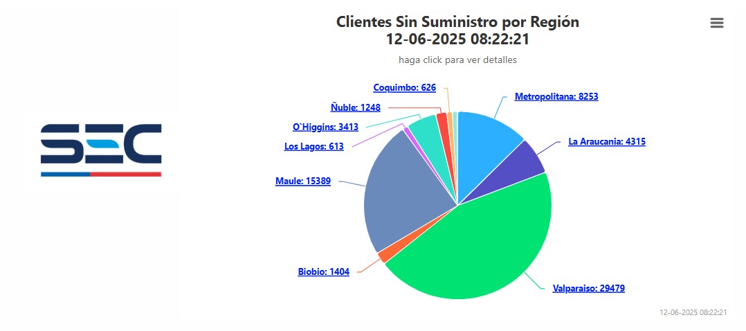 La región más afectada de momento es la de Valparaíso, con más de 30 mil hogares sin suministro, seguida por la del Maule, con 18 mil clientes sin luz.