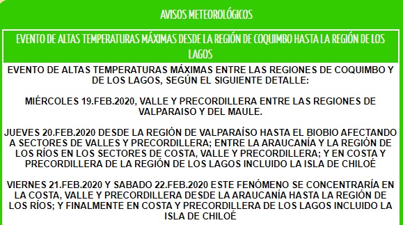 El calor del verano no sólo se limita al centro y norte del país. A partir de este jueves (20 febrero) abarcará gran parte del sur también con temperaturas que superarán 35 grados de máxima. Por lo mismo, Onemi declaró Alerta Temprana Preventiva entre las regiones de Coquimbo y Aysén en base a la información de la Dirección Meteorológica de Chile.