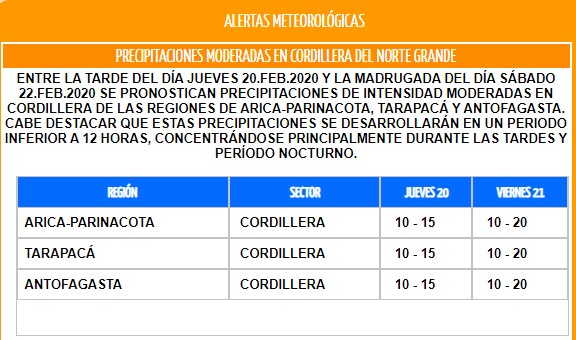 Al interior del norte grande, las precipitaciones estivales no se detienen. Ante eso, la Dirección Meteorológica de Chile emitió una Alerta con montos de lluvias superiores a 10 milímetros para este jueves (20 febrero) y viernes (21 febrero) en sectores cordilleranos de Arica-Parionacota, Tarapacá y Antofagasta.
