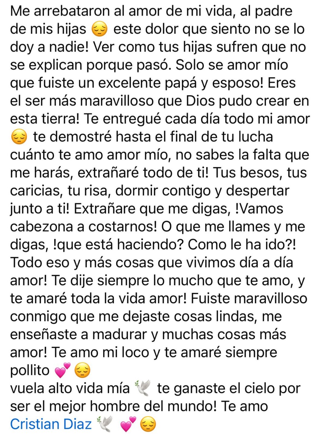 En esa misma línea, agregó: "Fuiste un excelente papá y esposo. ¡Eres el ser más maravilloso que Dios pudo crear en esta tierra! Te entregué cada día todo mí, amor. Te demostré hasta el final de tu lucha cuánto te amo".