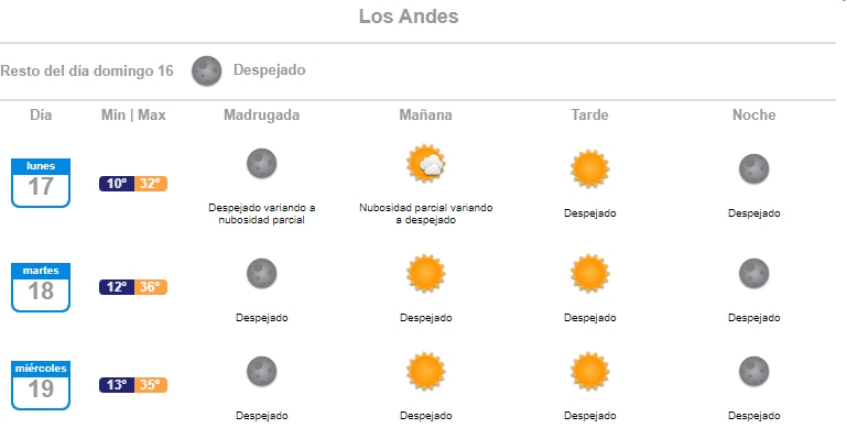 En tanto, en región de Valparaíso, la máxima que se registrará en Los Andes y San Felipe será de hasta 36°. Para la jornada del miércoles la temperatura disminuirá levemente y llegará a 35°.