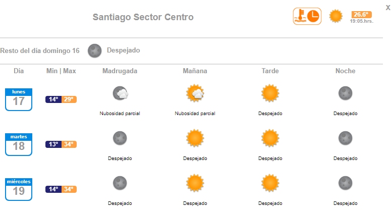 En el caso de la Región Metropolitana, Meteorología señala que en el sector centro de Santiago, la máxima alcanzará los 34° este martes y miércoles.