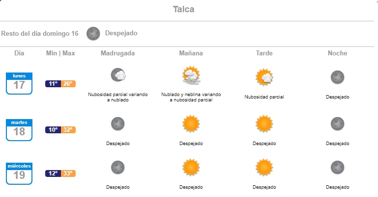 Por último, en Talca, Región del Maule, los termómetros alcanzarán una máxima de 32°C.