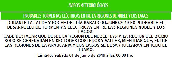 #Aviso A113-2/2019 (actualización): PROBABLES TORMENTAS ELÉCTRICAS ENTRE LA REGIONES DE ÑUBLE Y LOS LAGOS https://t.co/1gJOz4vxxc— MeteoChile (@meteochile_dmc) June 1, 2019