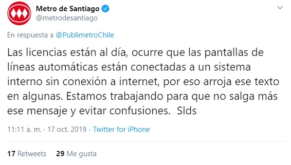 Desde Metro salieron a responder a los emplazamientos y aseguraron que "las licencias están al día, ocurre que las pantallas de líneas automáticas están conectadas a un sistema interno sin conexión a Internet, por eso arroja ese texto en algunas. Estamos trabajando para que no salga más ese mensaje y evitar confusiones".