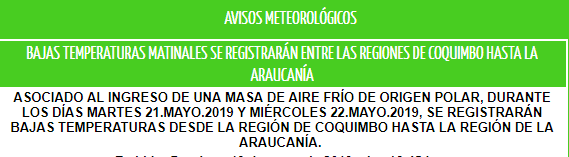 Este martes (21 mayo) y miércoles (22 mayo) habrá temperaturas bajo cero al interior entre las regiones de Coquimbo y La Araucanía. Esto debido a “una masa de aire frío de origen polar”, advierte la Dirección Meteorológica de Chile.