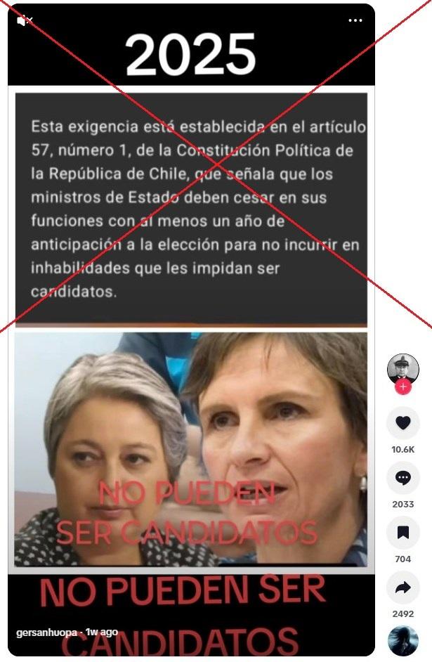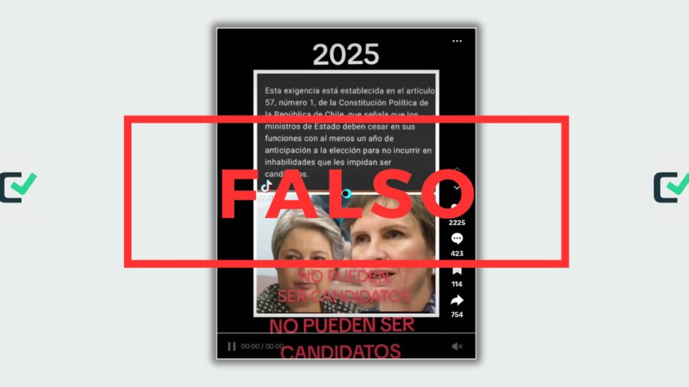 “Esta exigencia está establecida en el artículo 57, número 1, de la Constitución Política de la República de Chile, que señala que los ministros de Estado deben cesar en sus funciones con al menos un año de anticipación a la elección para no incurrir en inhabilidades que les impidan ser candidatos”, señalan publicaciones en Facebook, Instagram, TikTok y X.