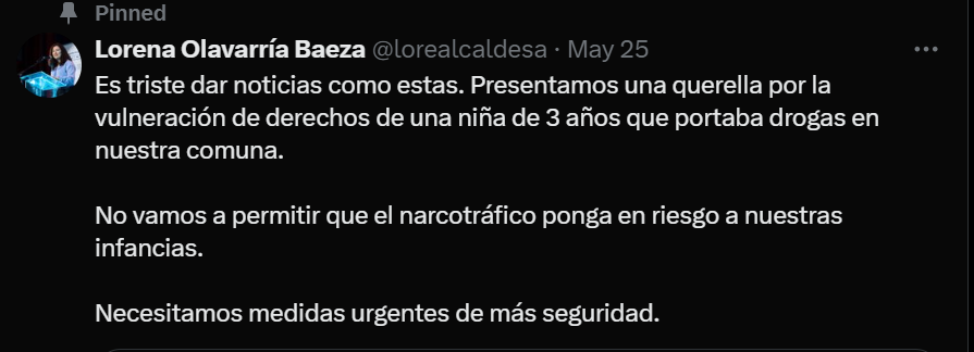 Al respecto, la edil de la comuna señaló a través de su cuenta de X: "Es triste dar noticias como estas. Presentamos una querella por la vulneración de derechos de una niña de 3 años que portaba drogas en nuestra comuna".