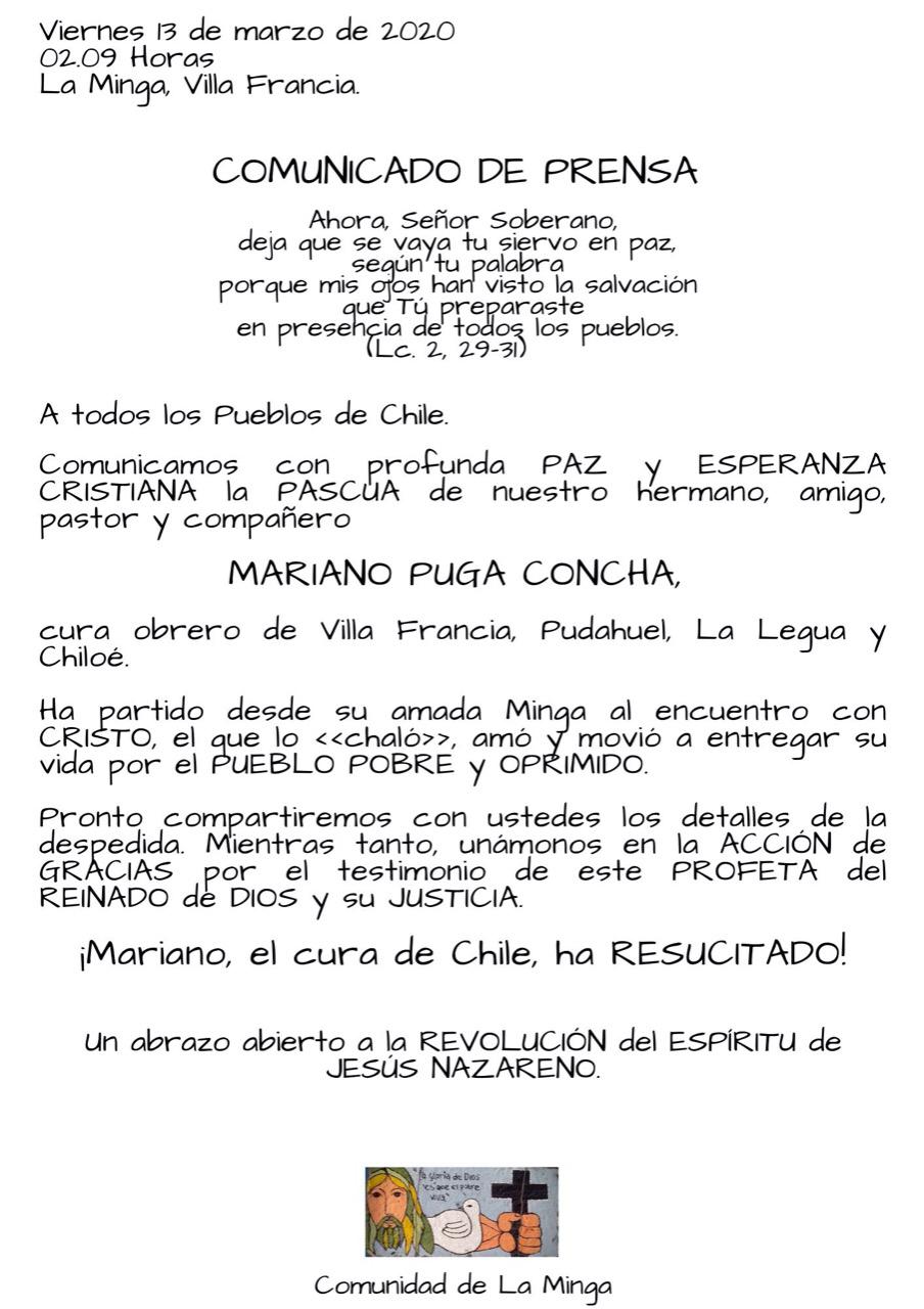El sacerdote falleció a los 88 años en su casa de la Comunidad de La Minga, en Villa Francia, a donde había regresado tras estar internado en el Hospital Clínico de la Universidad Católica. El año pasado había sido diagnosticado de cáncer linfático.