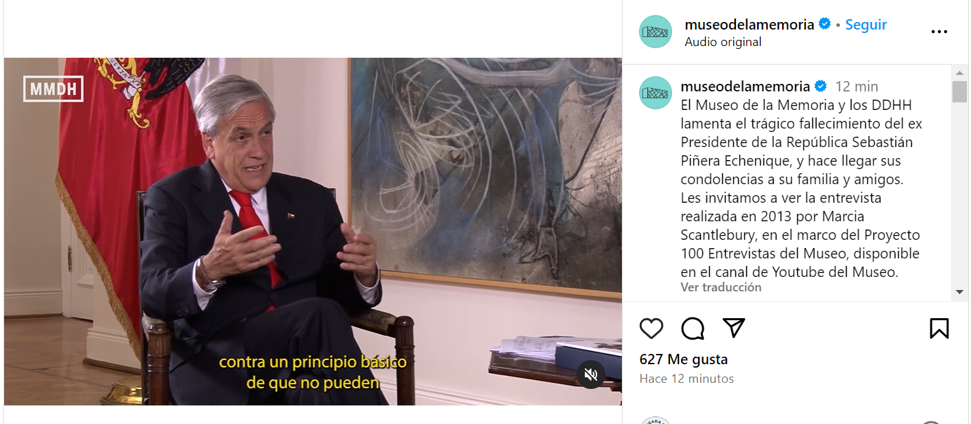 "El Museo de la Memoria y los DDHH lamenta el trágico fallecimiento del ex Presidente de la República Sebastián Piñera Echenique, y hace llegar sus condolencias a su familia y amigos. Les invitamos a ver la entrevista realizada en 2013 por Marcia Scantlebury, en el marco del Proyecto 100 Entrevistas del Museo", dice la publicación en Instagram acompañada del video. Una descripción mucho más breve que aquella publicada el martes, que abordaba distintos episodios en los que el ex mandatario se opuso públicamente a la dictadura, como su apoyo al "NO" en el plebiscito de 1988 y su condena a los "cómplices pasivos" de crímenes de lesa humanidad. Asimismo, en el post publicado días atrás hacían referencia a las violaciones de derechos humanos durante el estallido social: “En medio de su segundo gobierno (2018-2022) se produjo el estallido social, contexto en el que, de acuerdo a organismos nacionales e internacionales, se produjeron masivas violaciones a los derechos humanos”.