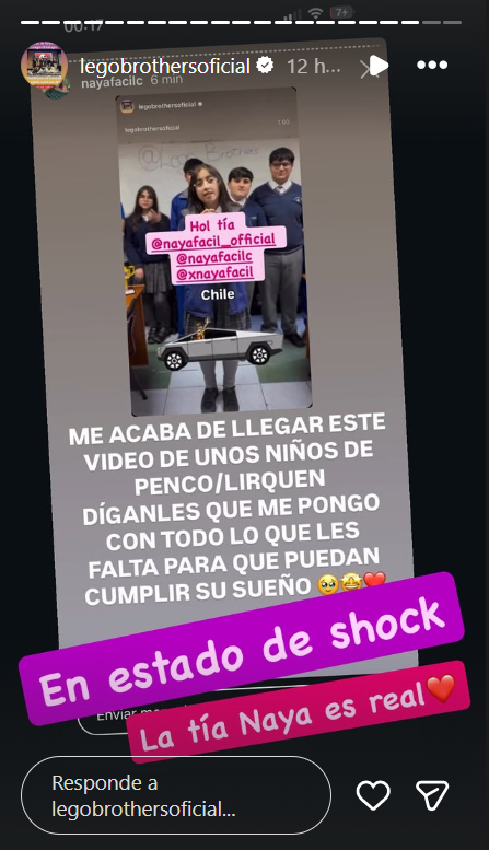 “Me acaba de llegar este video de unos niños de Penco-Lirquén. Díganles que me pongo con todo lo que falta para que puedan cumplir su sueño”, anunció Naya en su cuenta de Instagram.