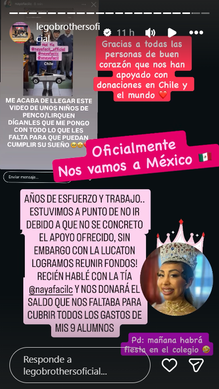 “Oficialmente, nos vamos a México. Años de esfuerzo y trabajo. Estuvimos a punto de no ir (…) Recién hablé con la tía Naya Fácil y nos donará el saldo que nos faltaba para cubrir todos los gastos de mis 9 alumnos”, señaló el grupo denominado Lego Brothers en redes sociales.
