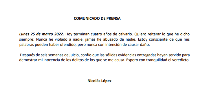 Mantuvo silencio durante todo el juicio, sin embargo, al término de la jornada de los alegatos finales en su contra, decidió hablar mediante un comunicado de prensa. De esa manera, el cineasta Nicolás López se refirió a las acusaciones que pesan en su contra por los delitos de violación y abuso sexual en carácter de reiterado y el delito de ultraje público, los que se habrían producido entre el 2004 y el 2016.