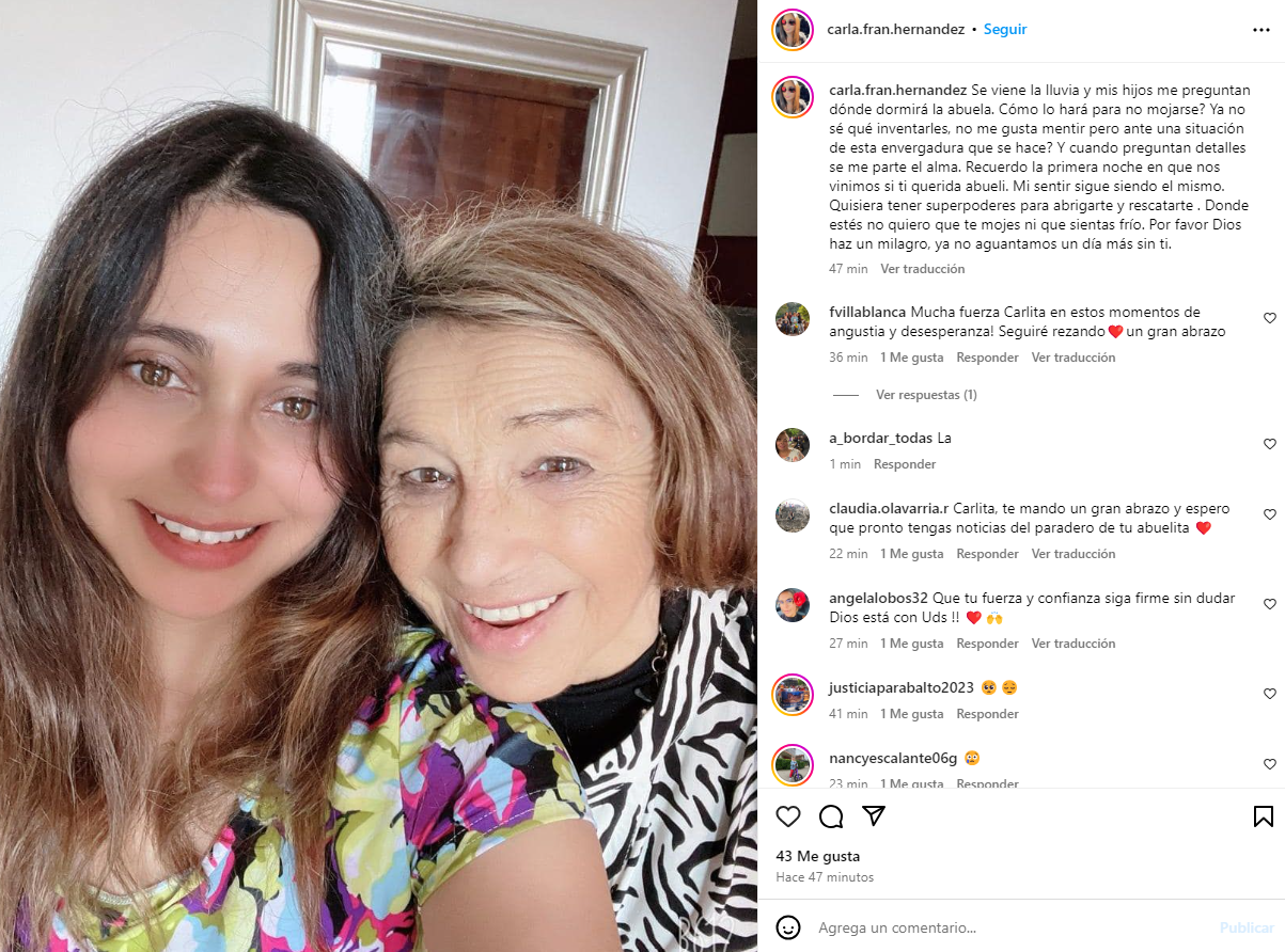 A varios días de la emergencia y sin obtener ninguna pista significativa que pueda dar con su paradero, Carla aseguró que "recuerdo la primera noche en que nos vinimos sin ti querida abueli. Mi sentir sigue siendo el mismo".