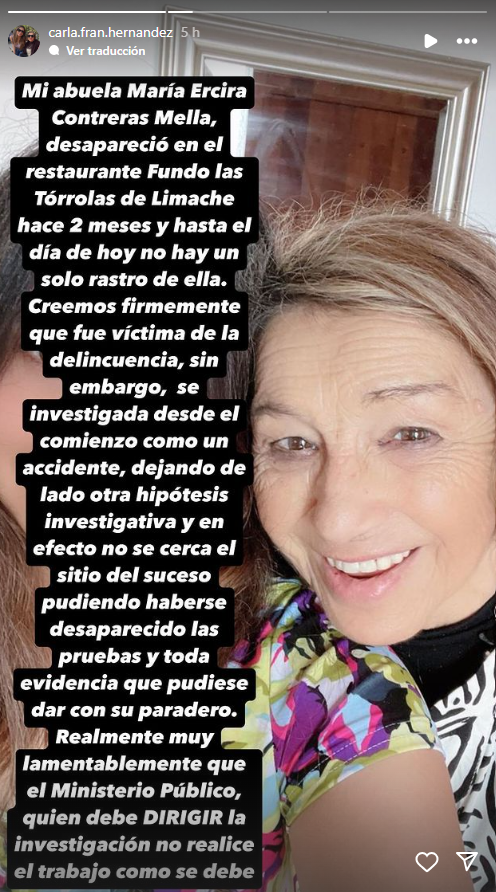 A exactos dos meses desde la desaparición de María Elcira Contreras, de 84 años, su nieta, Carla Hernández, reveló antecedentes respecto de lo ocurrido al día siguiente del extravío en el restaurante emplazado en el Fundo Las Tórtolas de Limache.