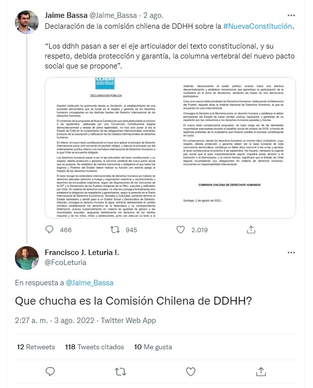 Todo comenzó luego de que Leturia respondiera a un tuit del ex convencional Jaime Bassa, quien compartió una declaración de la Comisión Chilena de Derechos Humanos (DD.HH.) sobre la propuesta de nueva Constitución.