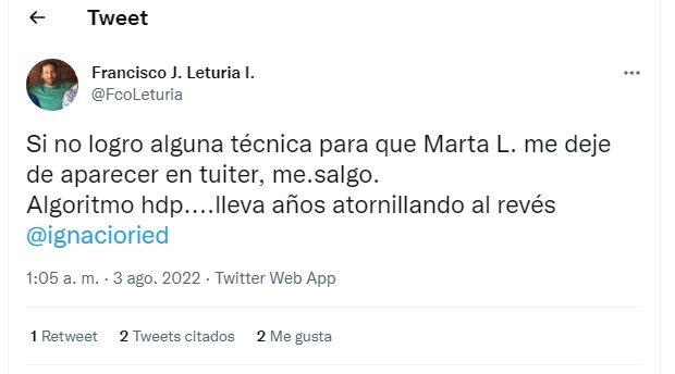 Sin embargo, no han sido las únicas palabras que han generado cuestionamientos. El pasado 3 de agosto, a través de la misma red social, Leturia señaló que "si no logro alguna técnica para que Marta L. (Lagos) me deje de aparecer en tuiter (sic), me salgo. Algoritmo hdp (sic)... lleva años atornillando al revés".