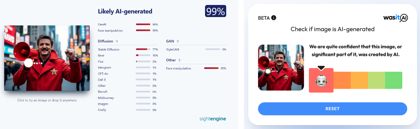 Por otro lado, la imagen que acompaña el texto viral tampoco es auténtica. El análisis con herramientas como Hive Moderation, Sight Engine y Was it AI? indica que fue creada con ayuda de una inteligencia artificial.