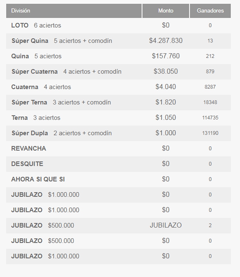 En cuanto al sorteo del domingo, se registraron 13 ganadores en la Súper Quina (5 aciertos más comodín), quienes se llevaron más de 4 millones de pesos cada uno. El detalle de los números ganadores del sorteo 4286 a continuación: