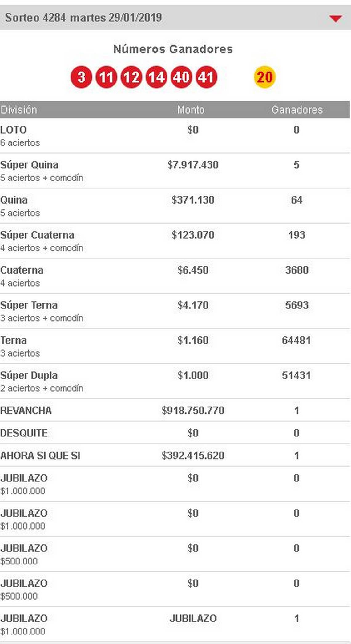 De acuerdo a la información entregada por la Polla Chilena de Beneficencia, no hubo ganadores con los seis aciertos, aunque sí hubo en el resto de las categorías como Super Quina, Súper Dupla, Revancha y Ahora, al igual que un Jubilazo de un millón de pesos. Hubo 2 millones 750 mil apuestas en esta ocasión.