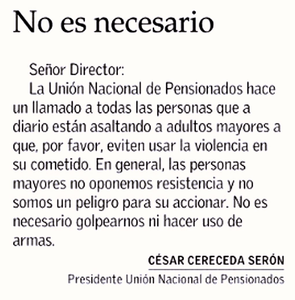 El presidente de la Unión Nacional de Pensionados, César Cereceda Serón, redactó una carta donde hizo un llamado a los asaltantes de adultos mayores a que, por favor, eviten usar la violencia.