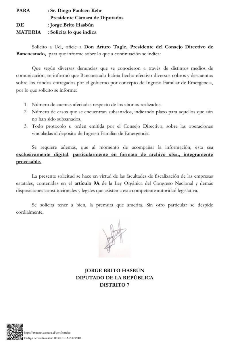 En concreto, el parlamentario pidió explicaciones en torno a las acciones que tomó el banco para dar solución al problema, tiempos de espera para reintegración de dineros y qué medidas se tomarán para evitar que el próximo pago del Ingreso Familiar de Emergencia sea cobrado de la misma manera.