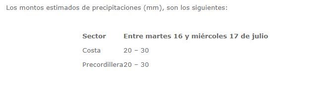 Te puede interesar: Osorno: Essal afirma que el miércoles a las 18 horas estará repuesto el suministro de agua en su totalidadSegún el informe, las precipitaciones comenzarían la mañana de este martes 16 y se extenderá hasta la mañana del miércoles 17 de julio.