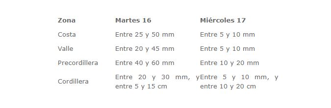 La Dirección Meteorológica de Chile prevé que las precipitaciones comenzarán la mañana de este martes 16 y se extenderán hasta la mañana del miércoles 17.