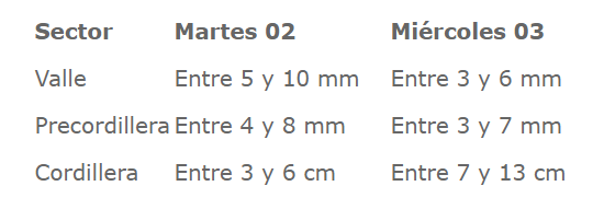 Adicionalmente, la DMC pronostica precipitaciones débiles en los sectores de valle, precordillera y cordillera de la capital, llegando hasta los 10 milímetros en el valle.