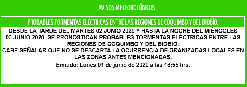 Lee también: Junio trae las lluvias a la zona central: Santiago recibirá entre 2 y 6 milímetros de agua#ONEMIOHiggins Se declara #Alerta Temprana Preventiva para la Región de O'Higgins por evento meteorológico. Infórmate https://t.co/P3nH4A41su pic.twitter.com/KjgdCfLT0P— onemichile (@onemichile) June 2, 2020
