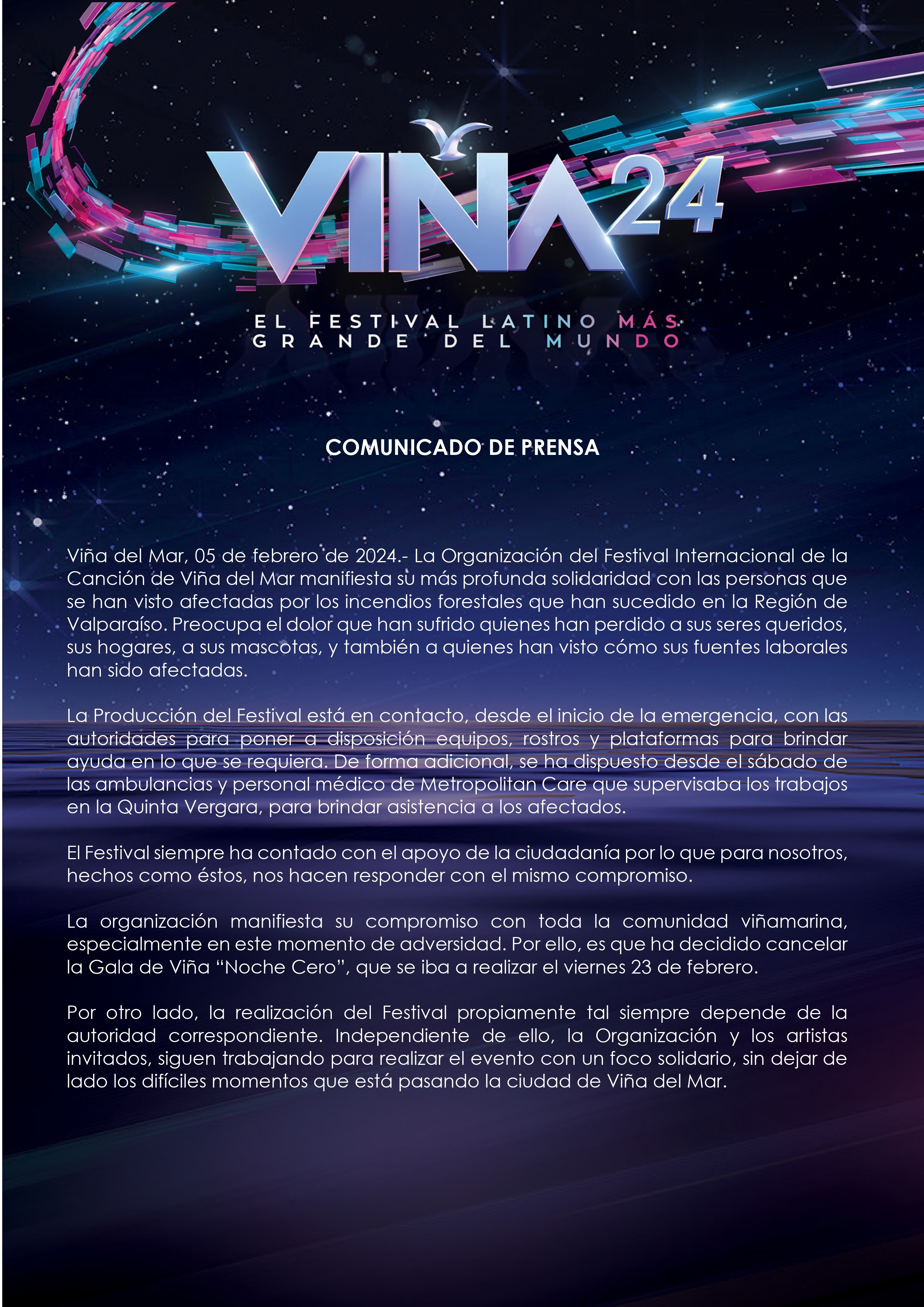 es que la Organización ha decidido cancelar la Gala de Viña “Noche Cero”, que se iba a realizar el viernes 23 de febrero", agregaron.