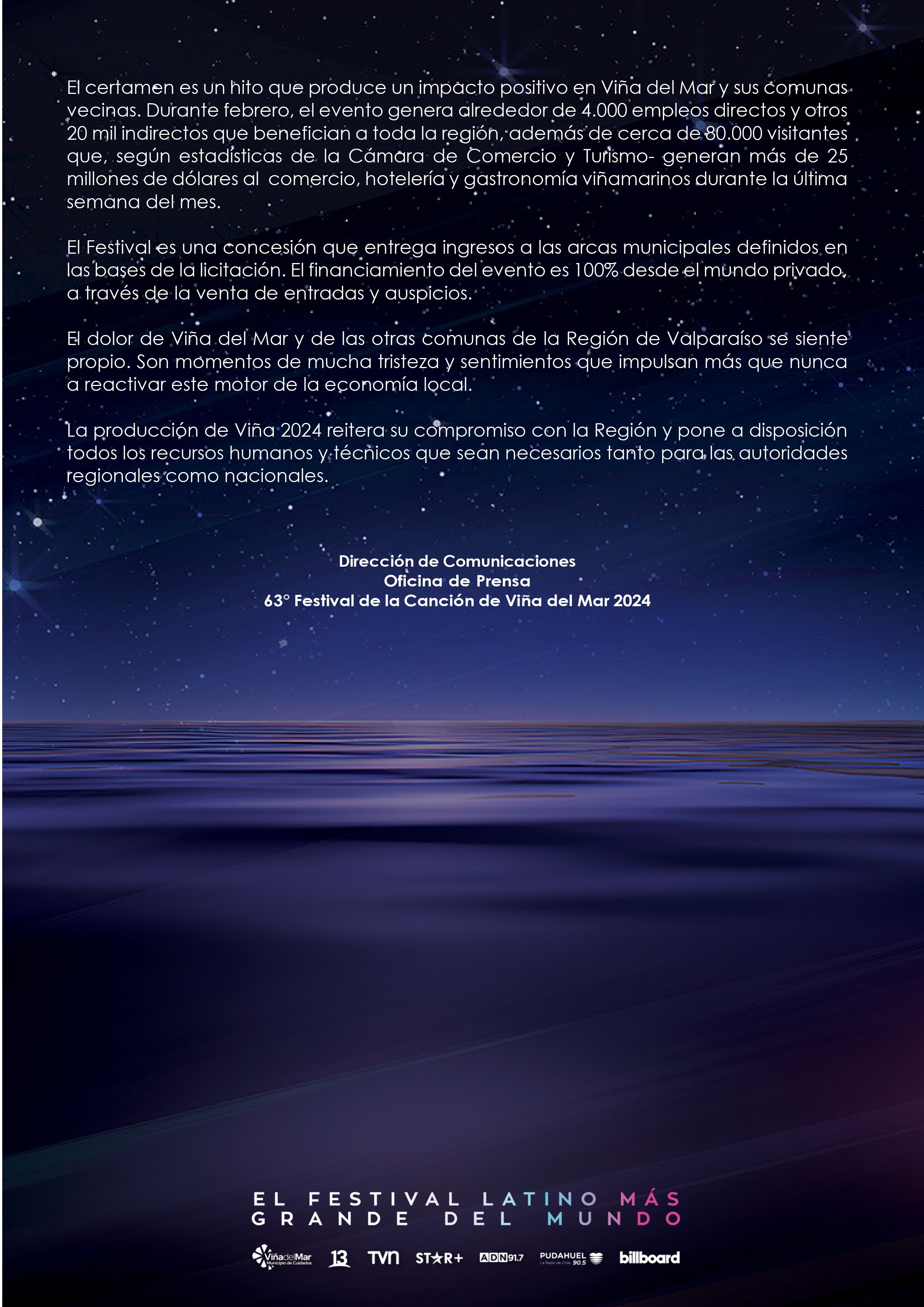 depende de la autoridad correspondiente. Independiente de ello, la Organización y los artistas invitados, siguen trabajando para realizar el evento con un foco solidario, sin dejar de lado los difíciles momentos que está pasando la ciudad de Viña del Mar".