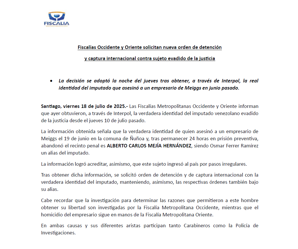 "La información obtenida señala que la verdadera identidad de quien asesinó a un empresario de Meiggs el 19 de junio en la comuna de Ñuñoa y, tras permanecer 24 horas en prisión preventiva, abandonó el recinto penal es ALBERTO CARLOS MEJÍA HERNÁNDEZ, siendo Osmar Ferrer Ramírez un alias del imputado", señala el documento.