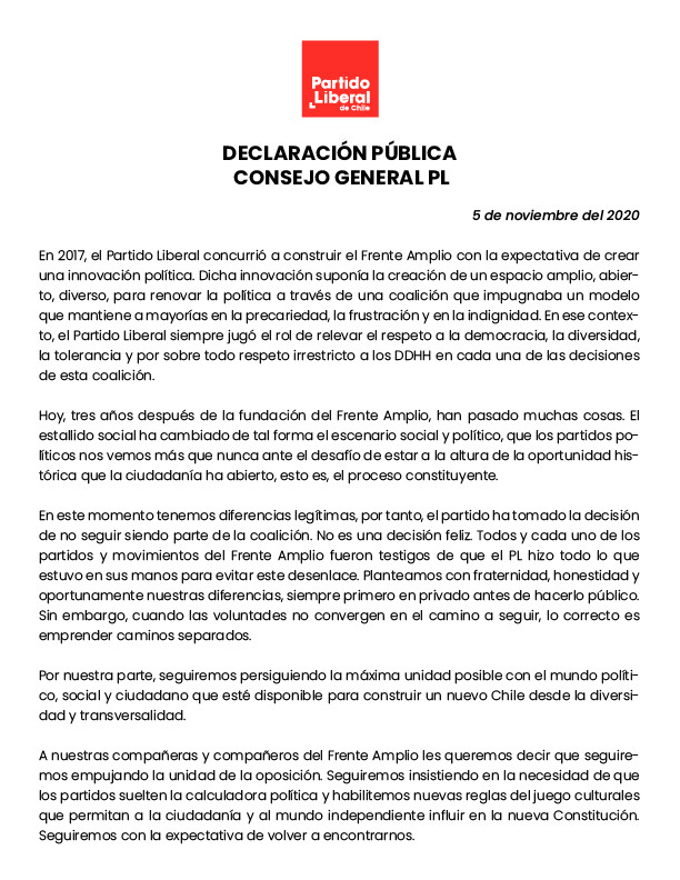 A través de una declaración pública, PL indicó que la determinación se debe a "diferencias legítimas". "No es una decisión feliz. Todos y cada uno de los partidos y movimientos del Frente Amplio fueron testigos de que el PL, hizo todo lo que estuvo en sus manos para evitar este desenlace".