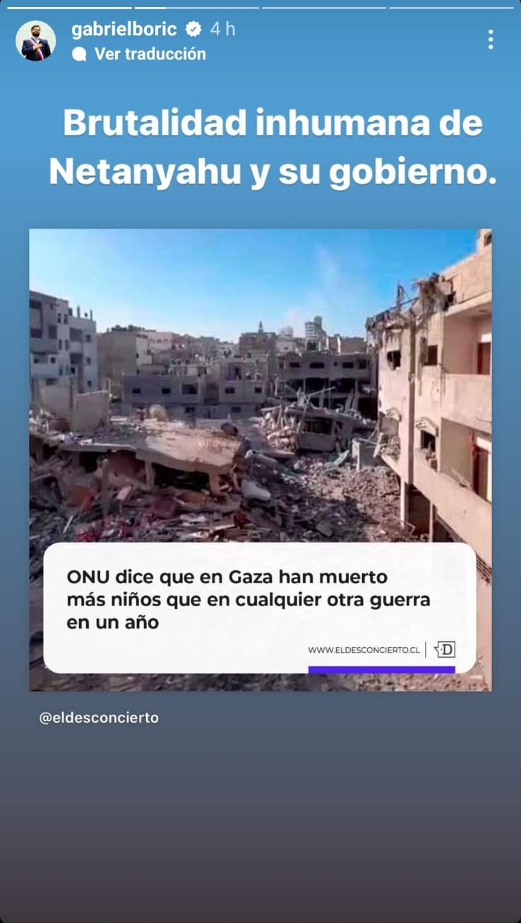 El Presidente Gabriel Boric arremetió contra el primer ministro de Israel, Benjamín Netanyahu, durante este domingo luego de publicar una historia en su cuenta de Instagram en la que criticó las numerosas muertes de niños en Gaza.